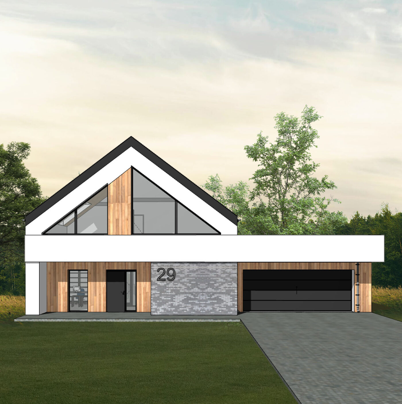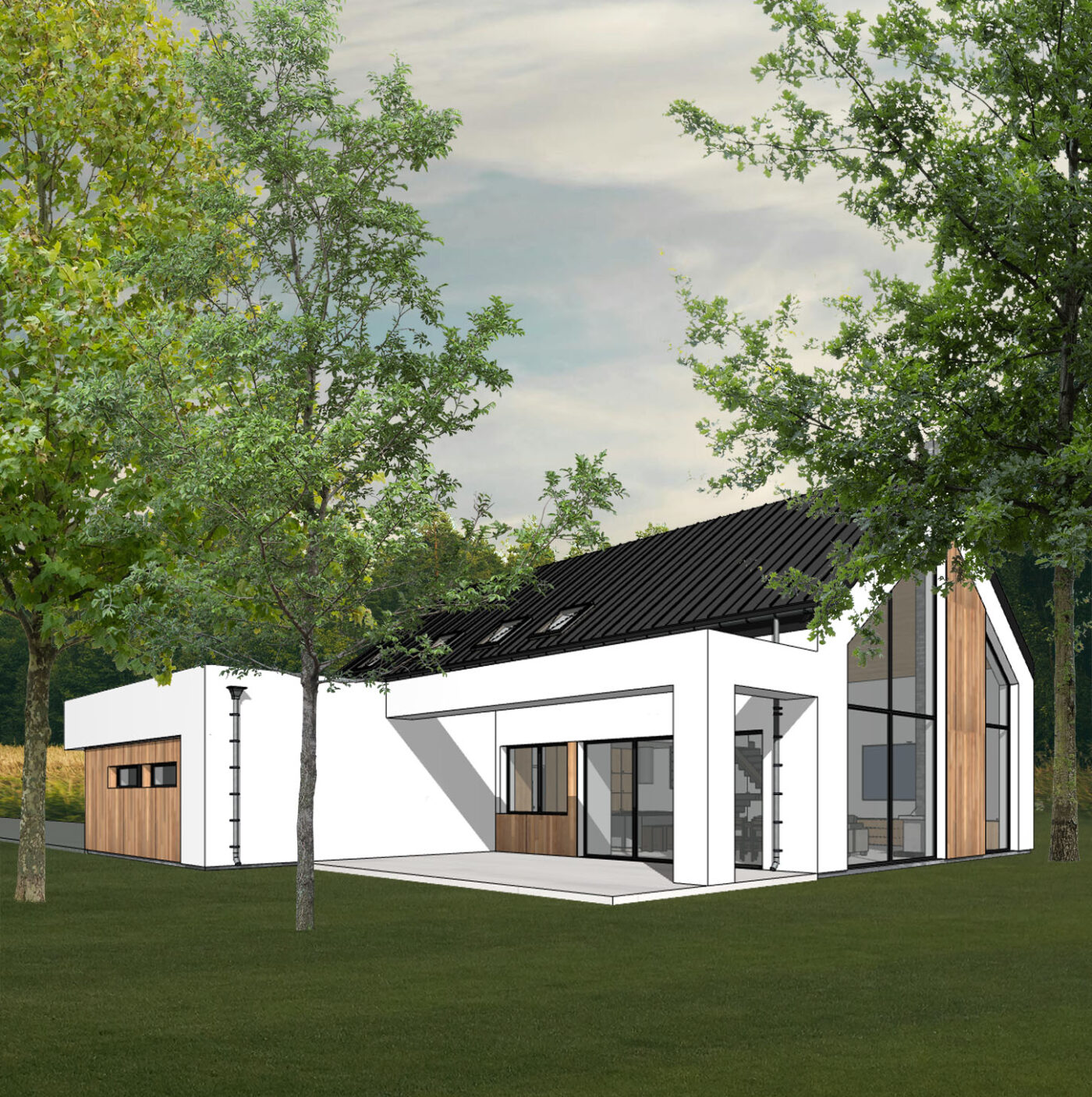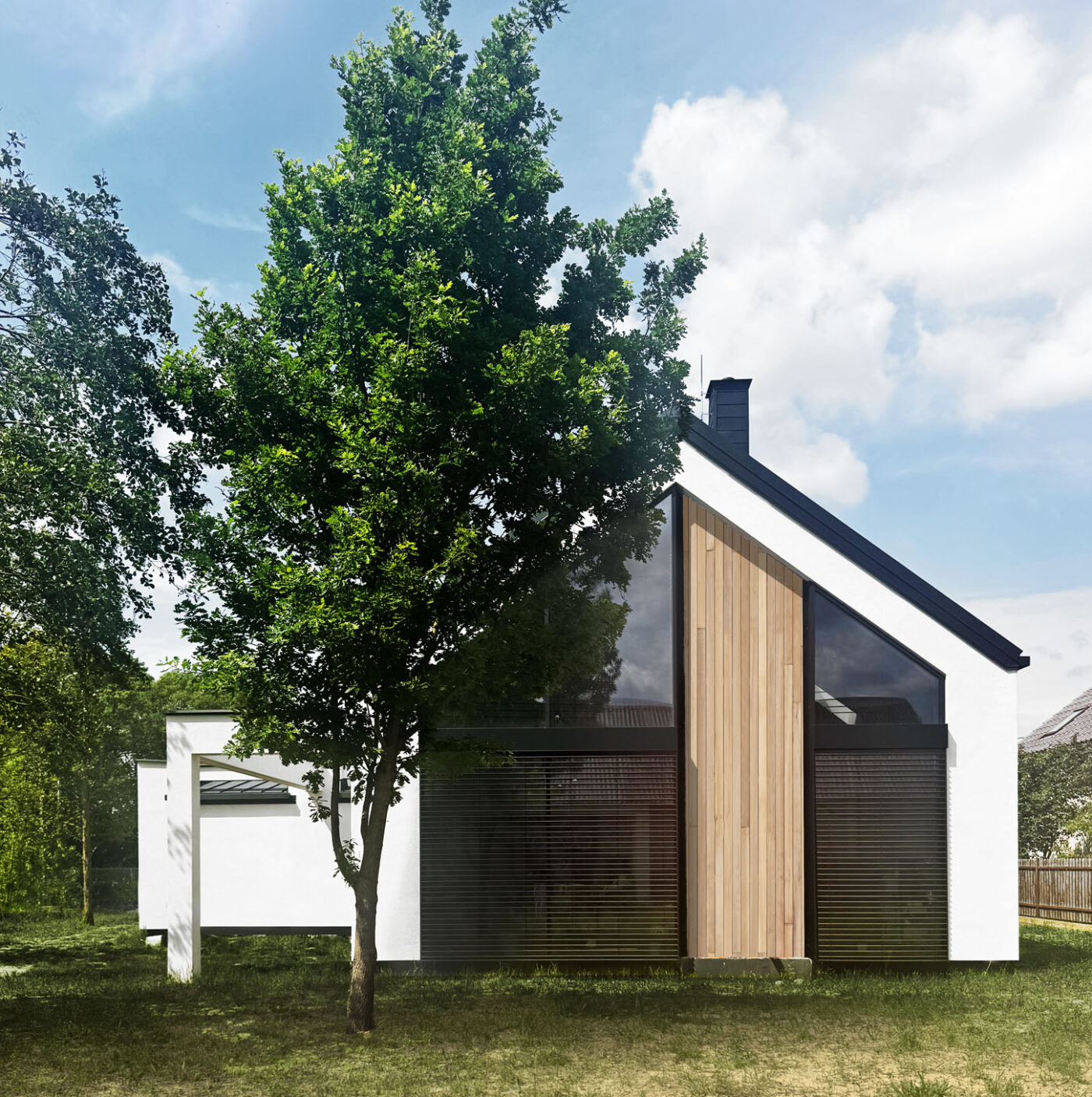 Po zakończeniu budowy wyraźnie widać, jak precyzyjnie projekt architektoniczny przełożył się na efekt końcowy. Porównanie wizualizacji z gotowym budynkiem pokazuje, jak wiernie realizacja odwzorowała założenia projektowe — zarówno w skali bryły, jak i w detalach.